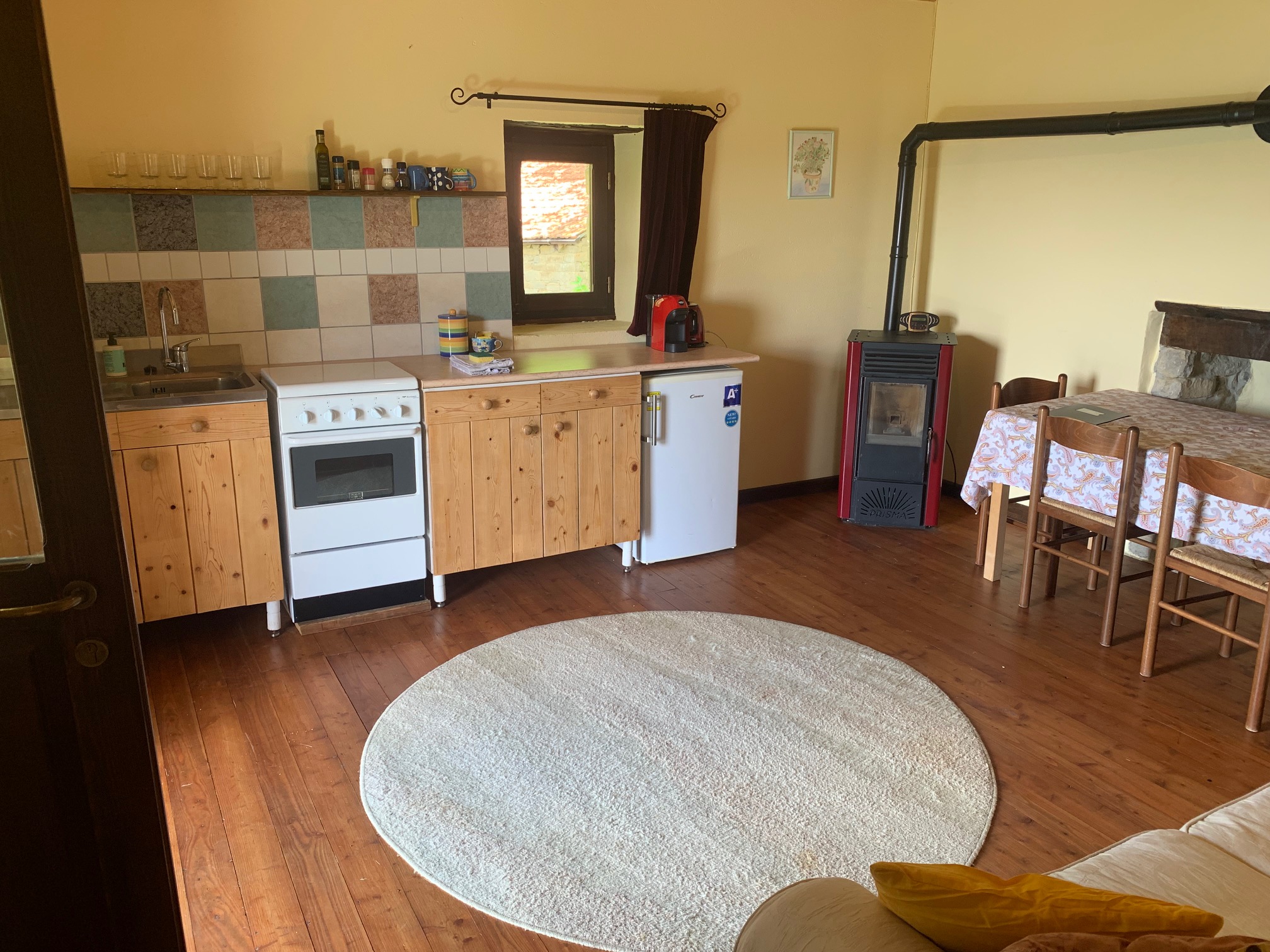 Gezellig en compleet appartement op de eerste verdieping, die te bereiken is via een houten trap aan de zijkant. Met prachtig uitzicht op het dal. Voorzien van een keuken-/eetkamer, badkamer met douche, toilet en wastafel. Verder een ruime aparte slaapkamer met een 2-persoonsbed. In keuken-/eetkamer staat een slaapbank voor 1 of 2 personen. De keuken is uitgerust met een 4-pits gasfornuis, een oven en een koelkast. Koffie kan worden gezet in de Lavazza A Modo Mio.