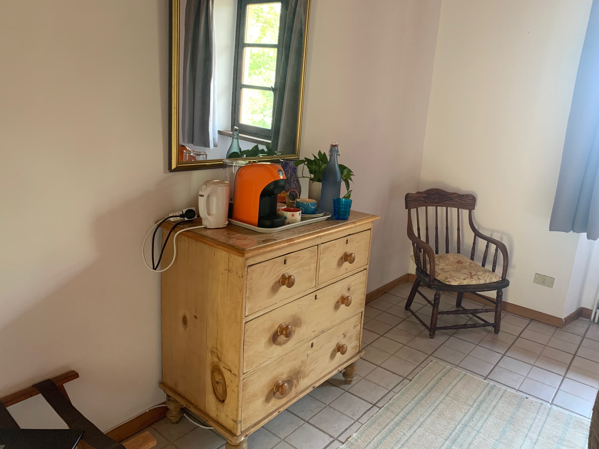 Dit is de vierde B&B-kamer vanaf de hoofdtrap. Vanuit het raam een mooi uitzicht op het dal. De kamer is uitgerust met 2 eenpersoonsbedden met comfortabele matrassen. Verder is er een badkamer met douche, wastafel en toilet. Op de kamer kan zowel koffie als thee gezet worden. Er is voor de B&B-kamers een gezamenlijk terras bij het gebouw.